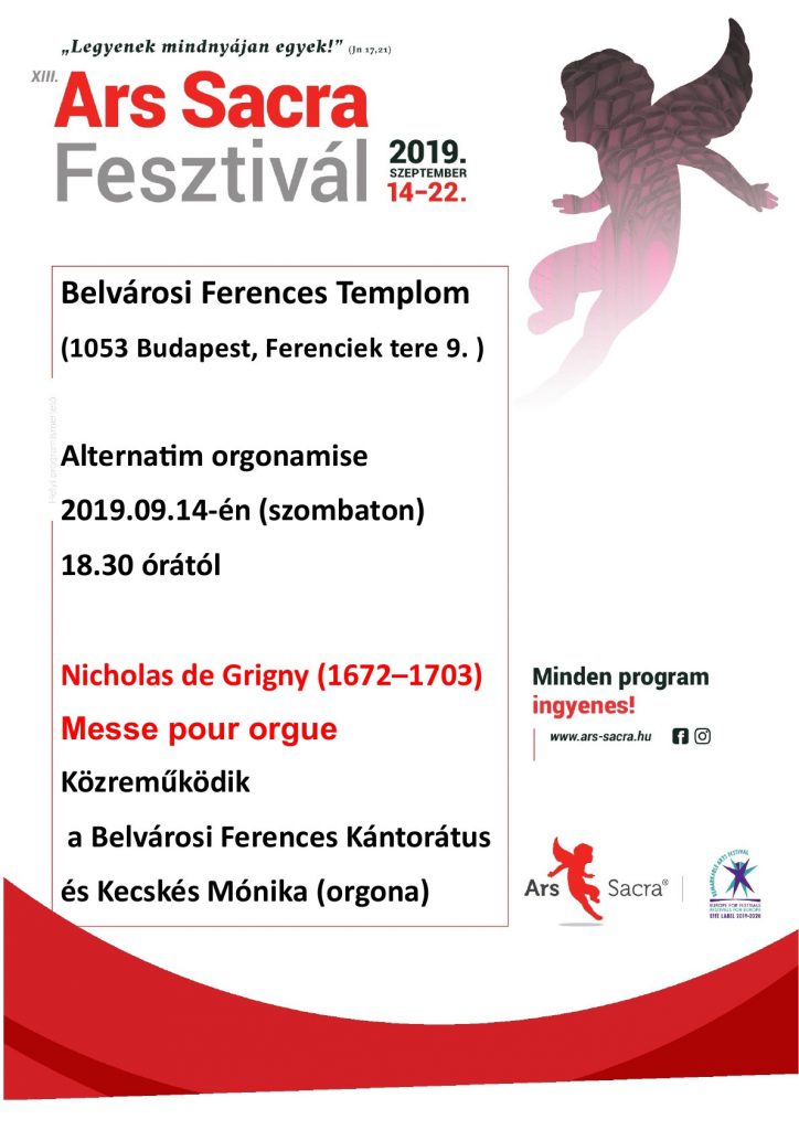 A Szent Művészet kincseit bemutató országos rendezvénysorozat (Ars Sacra) keretében a Belvárosi Ferences Templomban 2019. szeptember 14-én, szombat este a fél 7-es szentmise keretében hallhatjuk Nicholas de Grigny (1672-1703) alternatim orgonamiséjét. A kompozíció a kor általános szokása szerint a szentmise ordináriumtételeit alternatim módon, a kórus és az orgona váltakozásával szólaltatja meg.