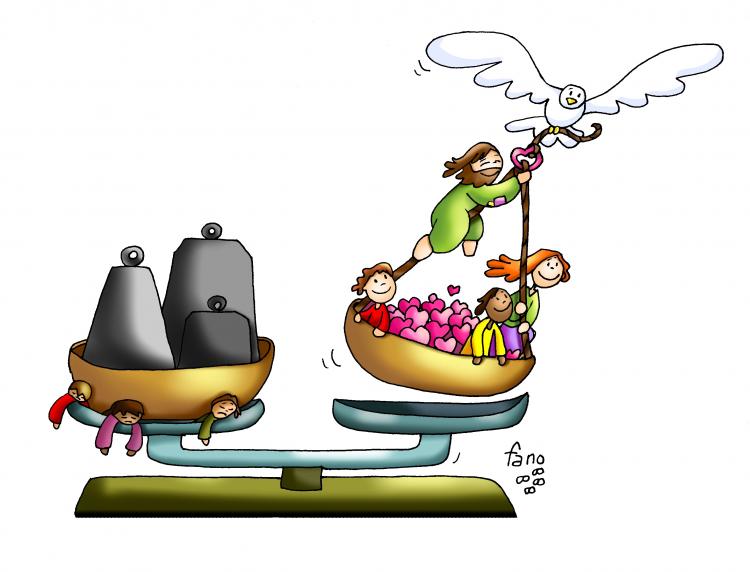 Ezért az Egyházra bízta halálának és föltámadásának emlékezetét, az irgalom szentségét, az egység jelét, a szeretet kötelékét, mint húsvéti lakomát, amelyben Krisztust fogadjuk szívünkbe, lelkünk megtelik kegyelemmel és megkapjuk a jövendő dicsőség zálogát.