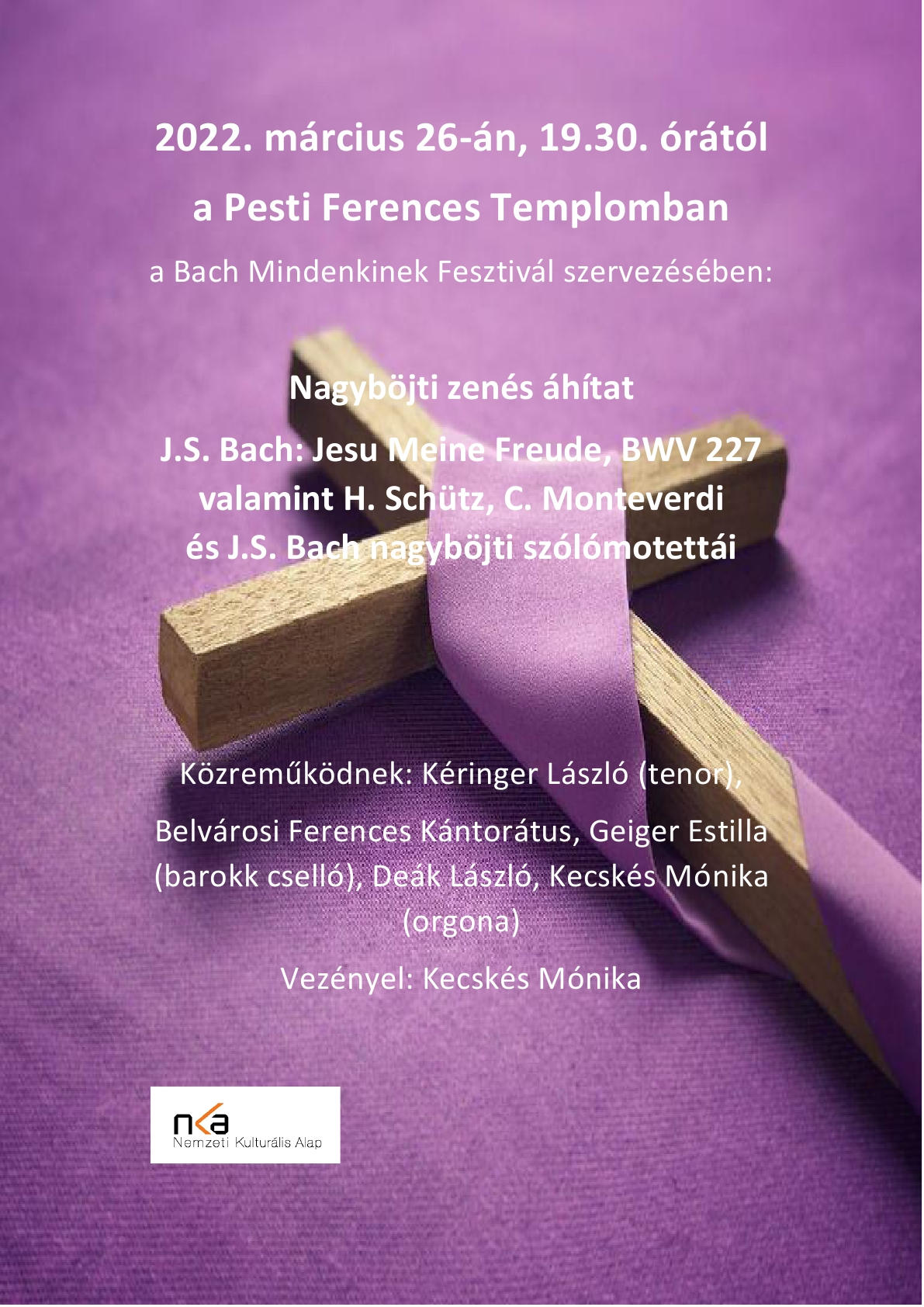 2022. március 26-án, szombaton 19.30 órától a Belvárosi Ferences Kántorátus és neves szólisták előadásában elhangzik J.S. Bach Jesu meine Freude c. korálmotettája, valamint Bach, Monteverdi és Schütz nagyböjti áriái.