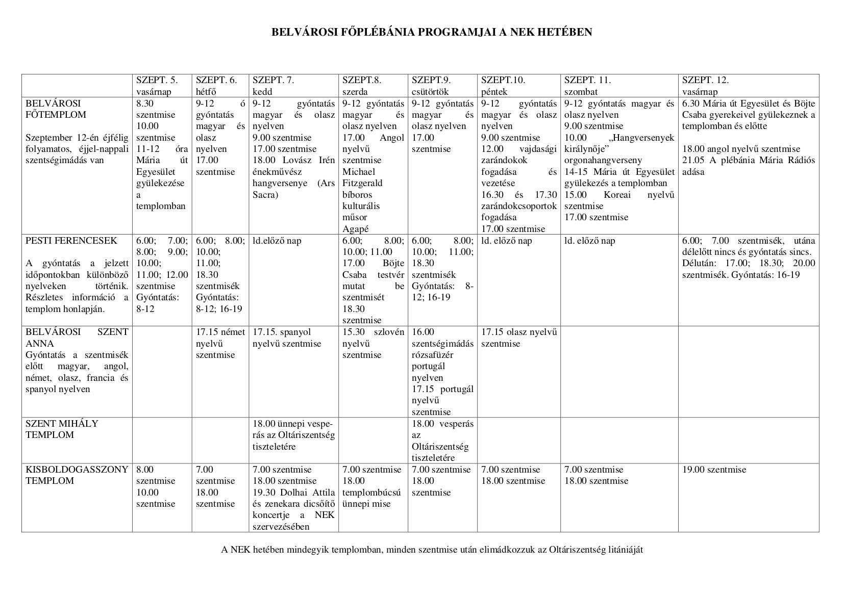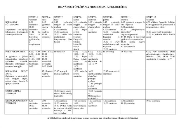 A Belvárosi Főplébánia területén levő 5 templom programja az Eucharisztikus Kongresszus hetében