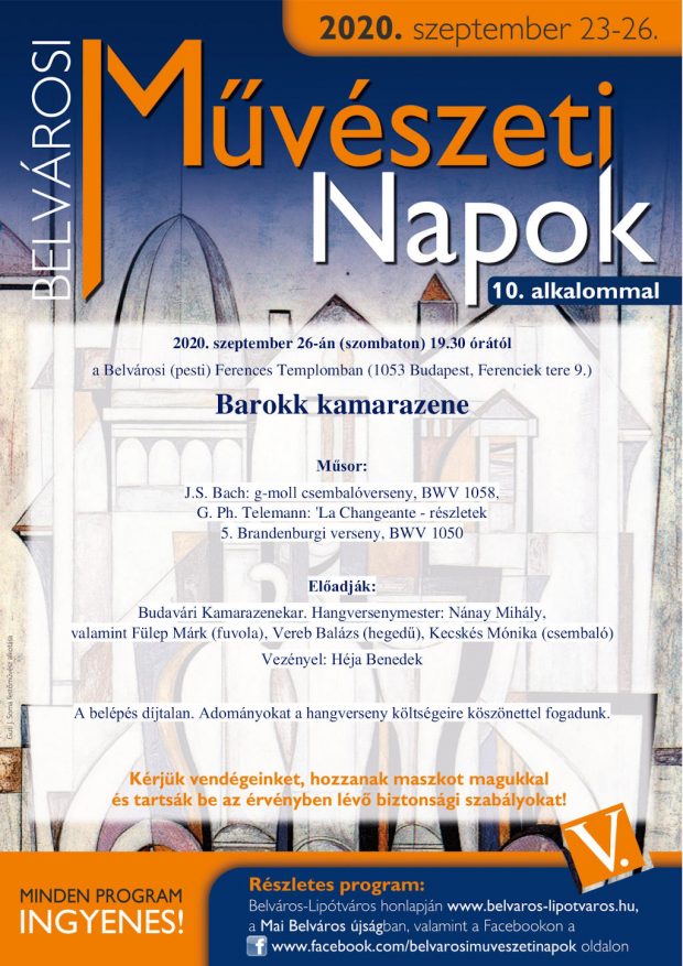 Belvárosi Művészeti Napok keretében szeptember 26-án, szombaton este fél 8-tól barokk kamarazene hangzik el a Budavári kamarazenekar és hangszeres szólisták előadásában. A részletes műsor az alábbi plakáton olvasható.