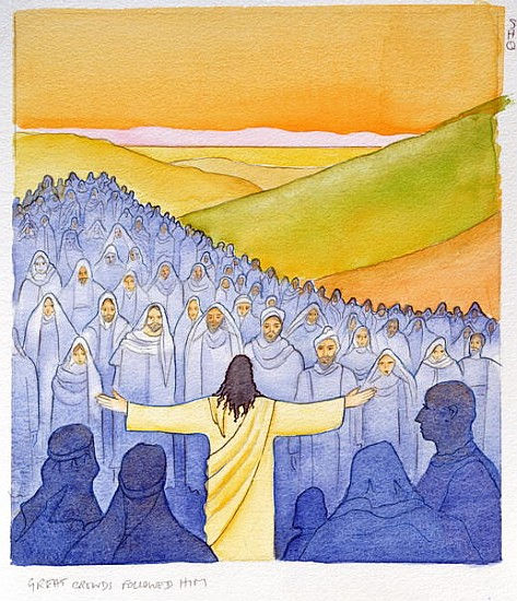 Közben a nép kereste Jézust. Ők nem a tanítványok pihenését akarták megzavarni, hanem Jézust akarták hallgatni. Az emberek is fáradtak és kimerültek voltak, hiszen napokon keresztül kitartóan követték Őt. Nagyobb távolságokat is képesek voltak megtenni, hogy láthassák, hallgathassák Őt. Szinte észre sem vették, hogy nincs ennivalójuk, mivel fontosabb volt számukra az Úr tanításának lelki tápláléka.