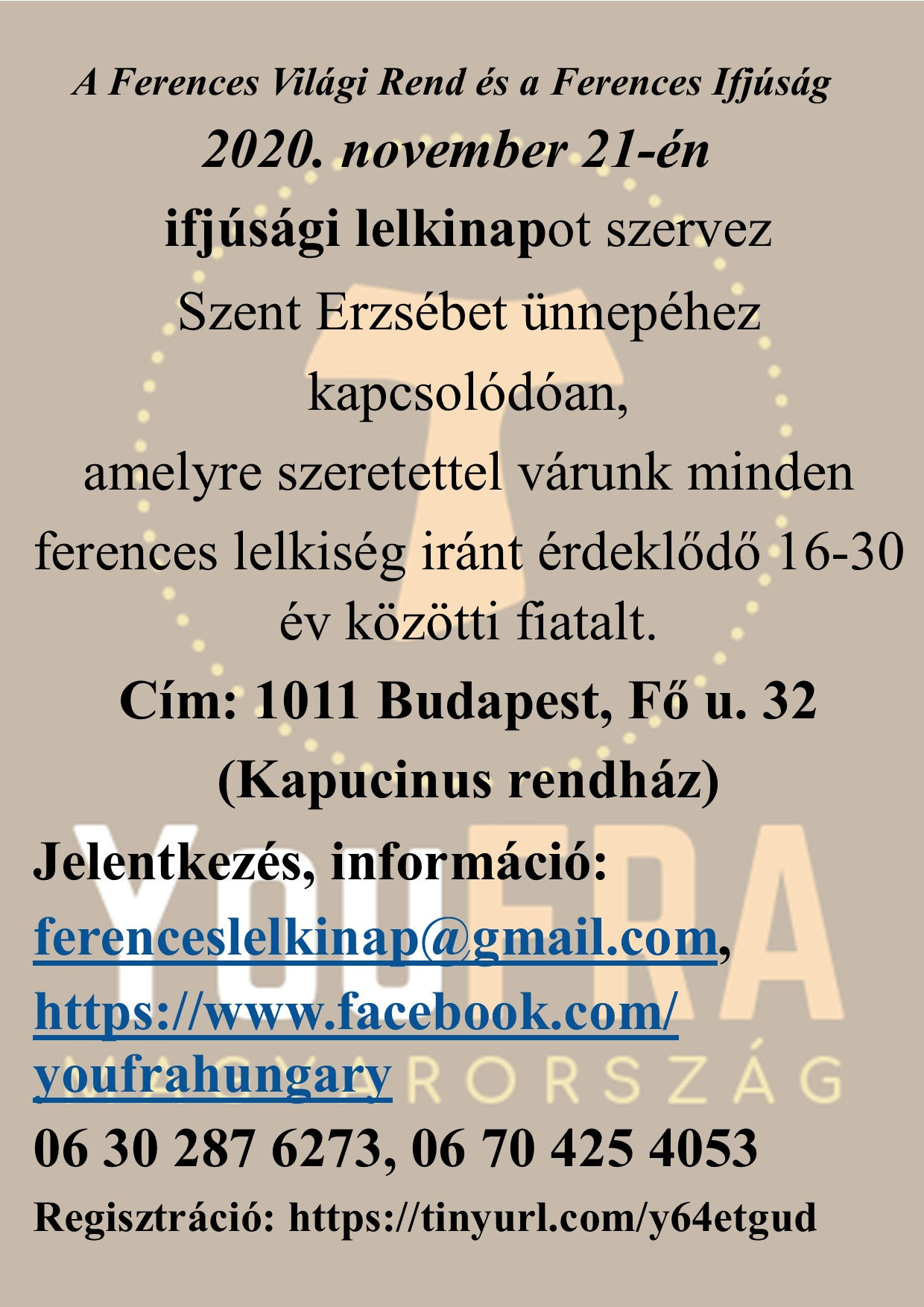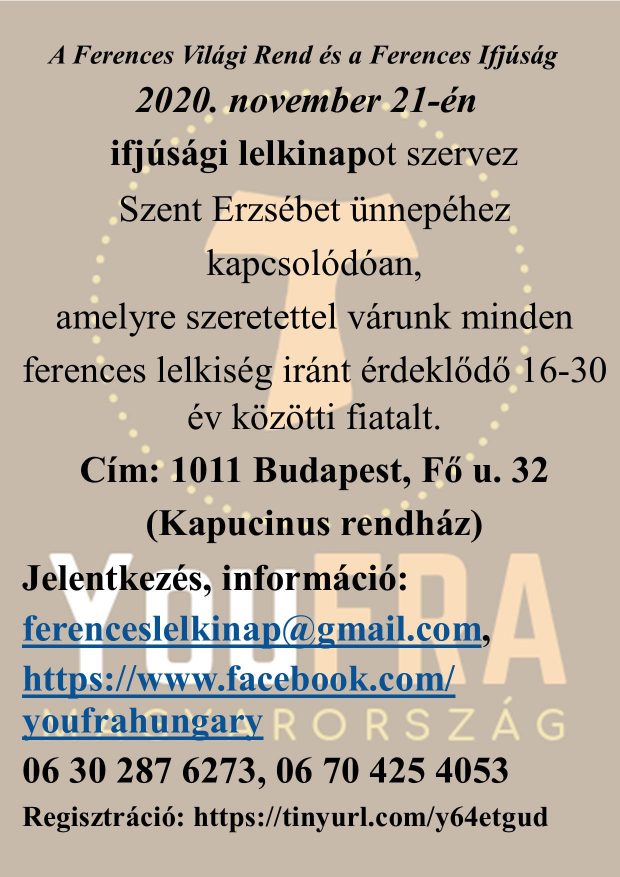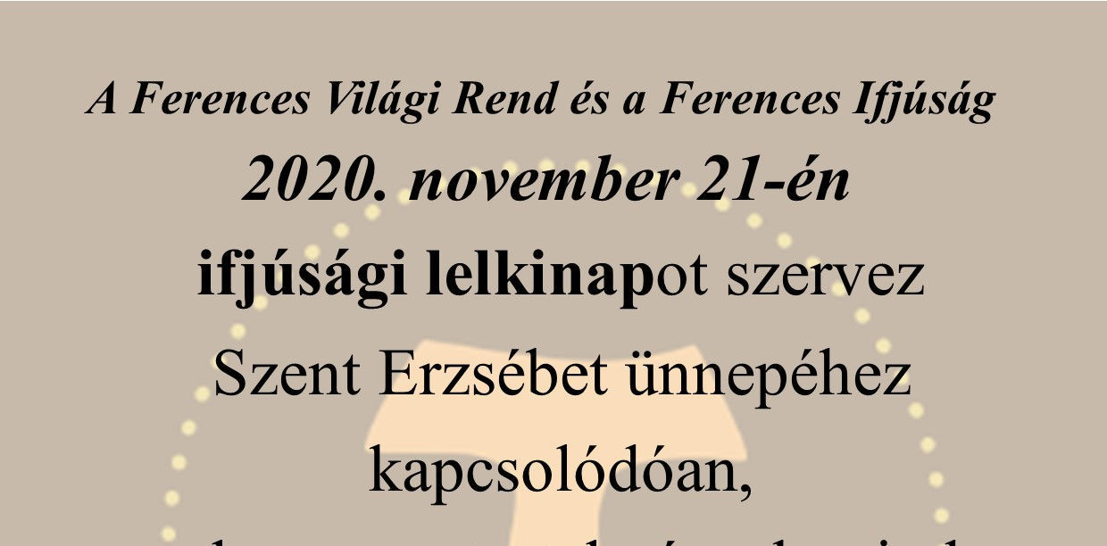A Ferences Világi Rend és a Ferences Ifjúság közös szervezésében lelkinap lesz 2020. november 21-én, szombaton, melyre a ferences lelkiség iránt érdeklődő 16-30 év közötti fiatalok jelentkezését várjuk.