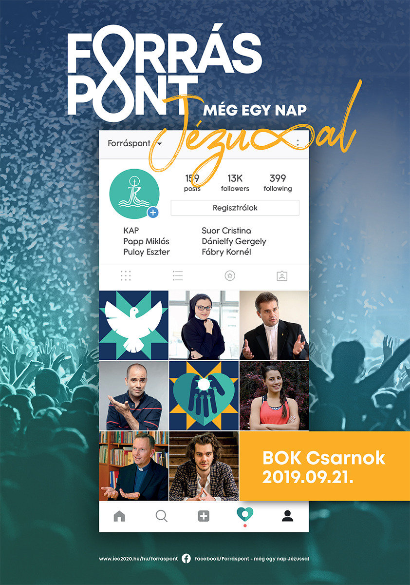 A Nemzetközi Eucharisztikus Kongresszus (NEK) Általános Titkársága „ForrásPont – Még egy nap Jézussal” címmel ifjúsági eucharisztikus napra hívja a 15 és 30 év közötti fiatalokat szeptember 21-re, szombatra a budapesti BOK Csarnokba.