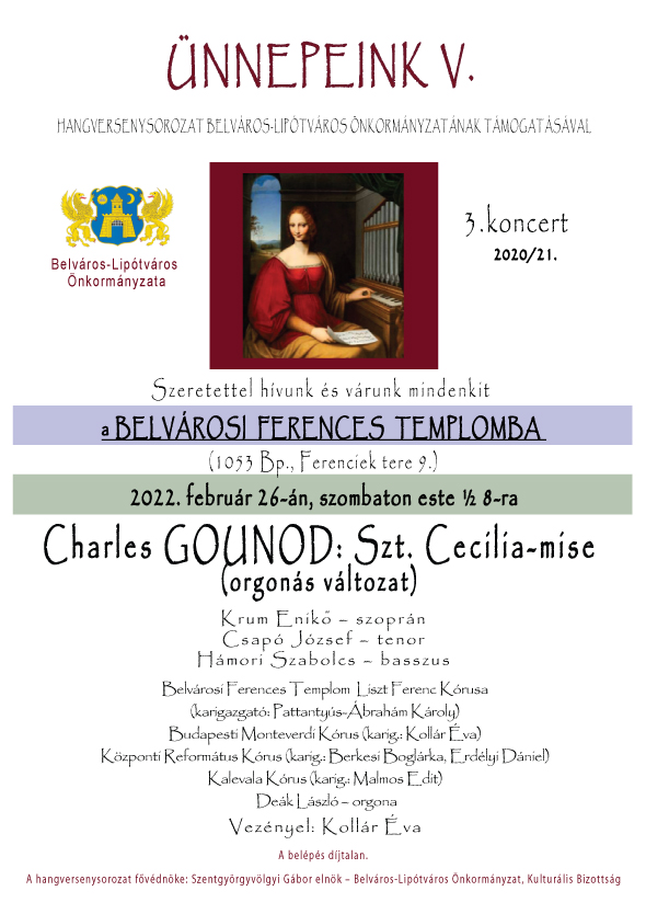 Febr. 26-án, szombaton este fél 8-kor templomunk Liszt Ferenc Kórusa több énekkarral együtt, szólisták és orgona közreműködésével előadja Gounod: Szent Cecília mise c. művét.