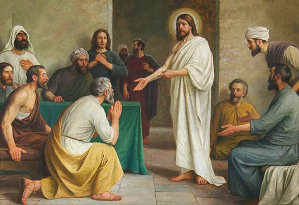 Amikor a hét első napján (Húsvétvasárnap) beesteledett, Jézus megjelent a tanítványoknak ott, ahol együtt voltak, pedig a zsidóktól való félelmükben zárva tartották az ajtót. Belépett és így szólt hozzájuk: „Békesség nektek!” Miután ezt mondta, megmutatta nekik a kezét és az oldalát. Az Úr láttára öröm töltötte el a tanítványokat. Jézus megismételte: „Békesség nektek! Amint engem küldött az Atya, úgy küldelek én is titeket.” E szavak után rájuk lehelt és így folytatta: „Vegyétek a Szentlelket! Akinek megbocsátjátok bűneit, az bocsánatot nyer, s akinek nem bocsátjátok meg, az nem nyer bocsánatot.”
