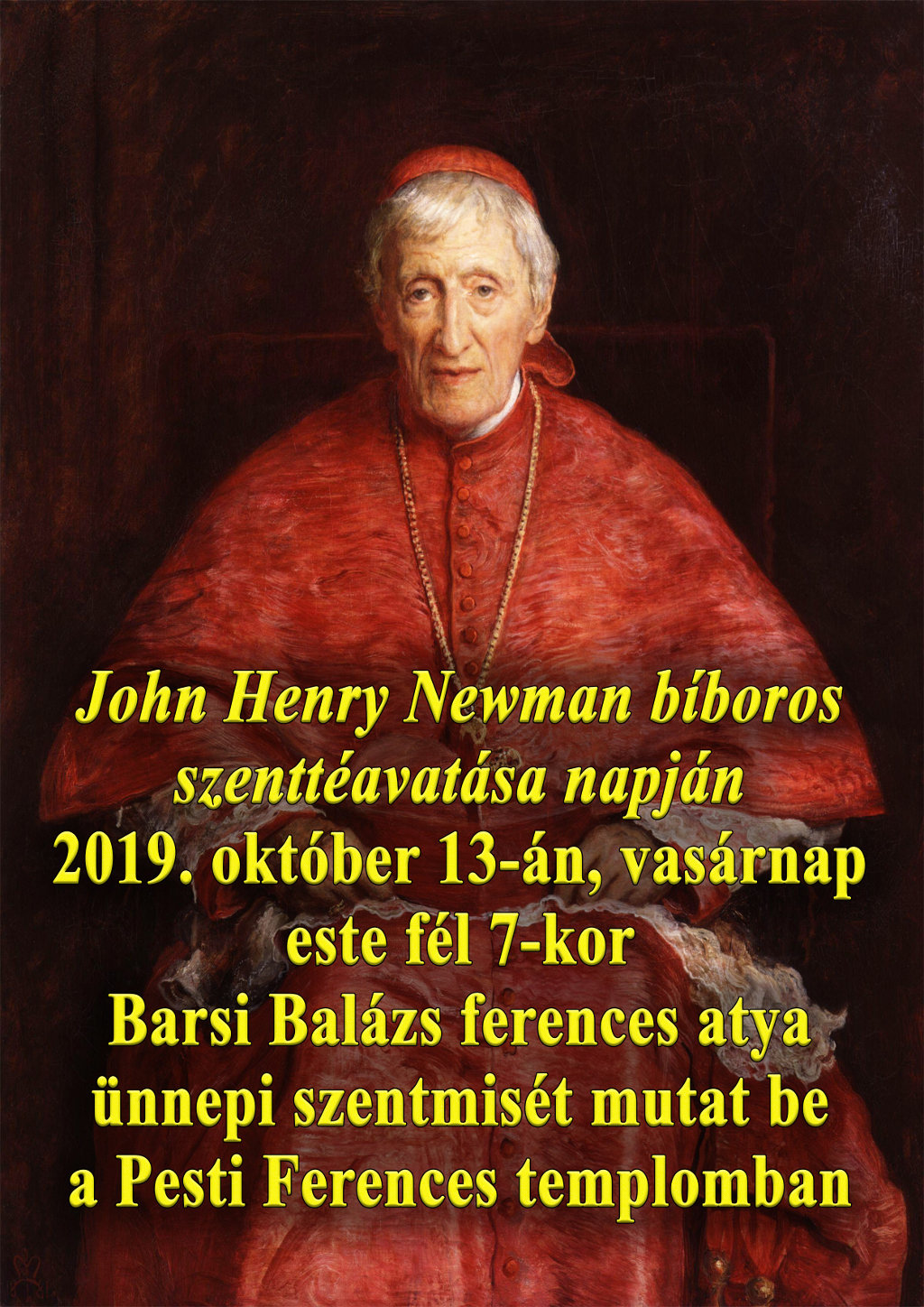 John Henry Newman bíboros szenttéavatása napján, 2019. október 13-án, vasárnap este fél 7-től ünnepi szentmise lesz templomunkban, melyet Barsi Balázs ferences atya mutat be. A liturgia énekeit a Belvárosi Ferences Kántorátus szolgálata fogja segíteni.