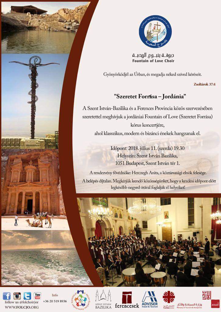 A Szent István Bazilika és a Ferences Rendtartomány közös szervezésében magyarországi koncertkörútra érkezik Jordániából a Fountain of Love, vagyis a Szeretet Forrása nevű kórus, akik Budapesten a Szent István Bazilikában július 11-én 19.30-kor adnak koncertet.