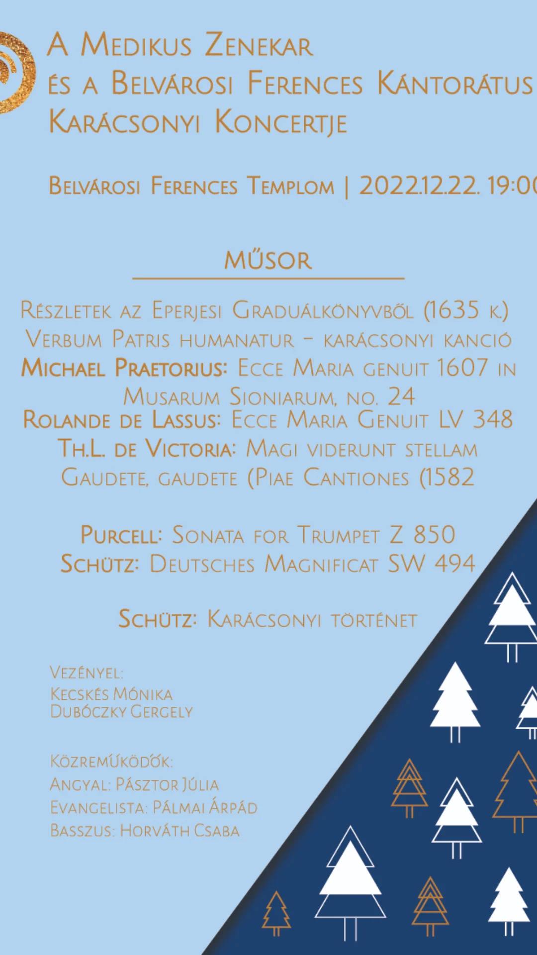 Karácsonyi hangversenyt tartunk dec. 22-én, csütörtök este fél 8-tól templomunk Kántorátusának és a Medikus Zenekar közreműködé­sével.
