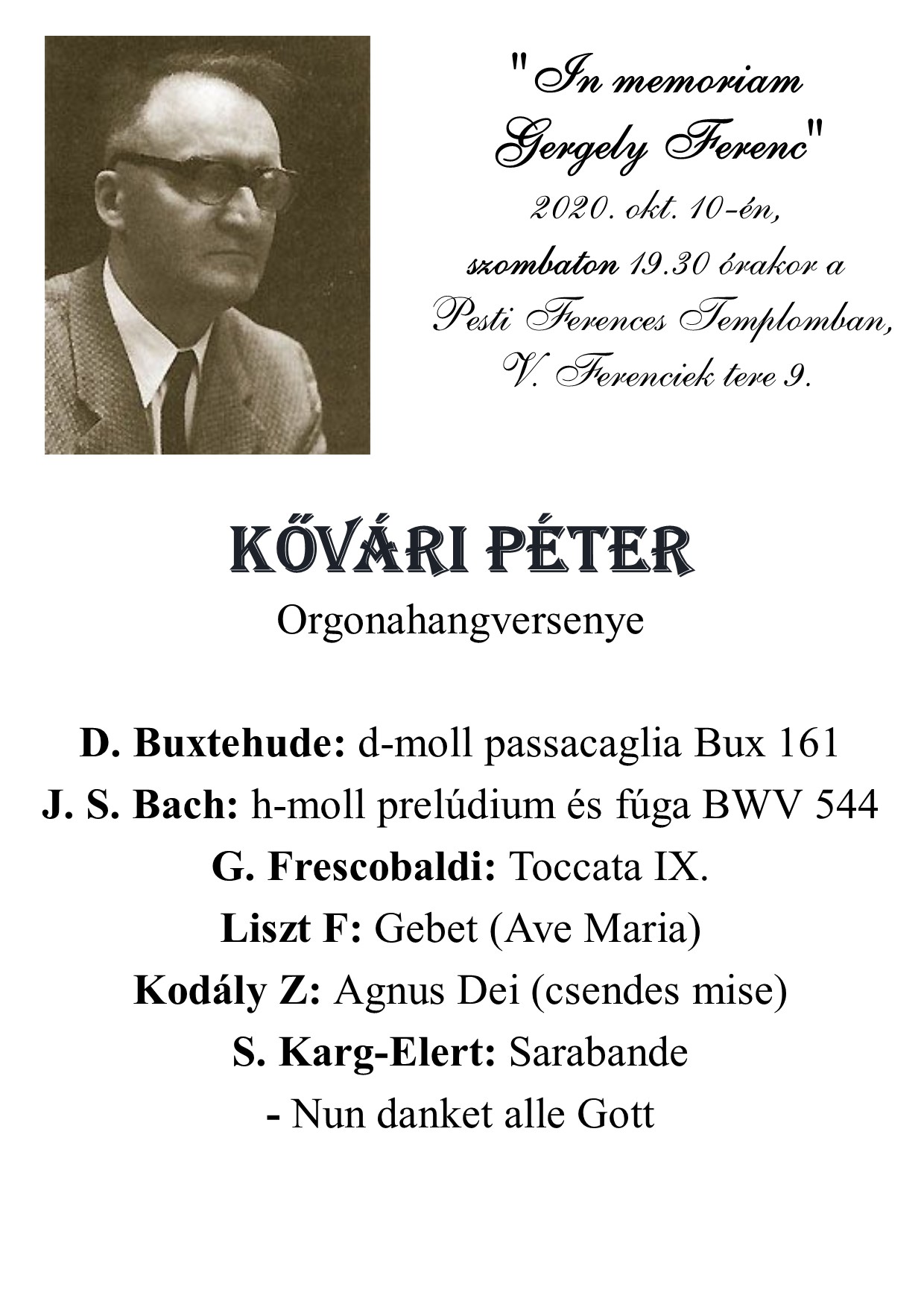A Gergely Ferenc emléksorozat keretében 2020. okt. 10-én, szombaton este fél 8-tól Kővári Péter orgonazenés áhítata lesz. Szeretettel várunk mindenkit.