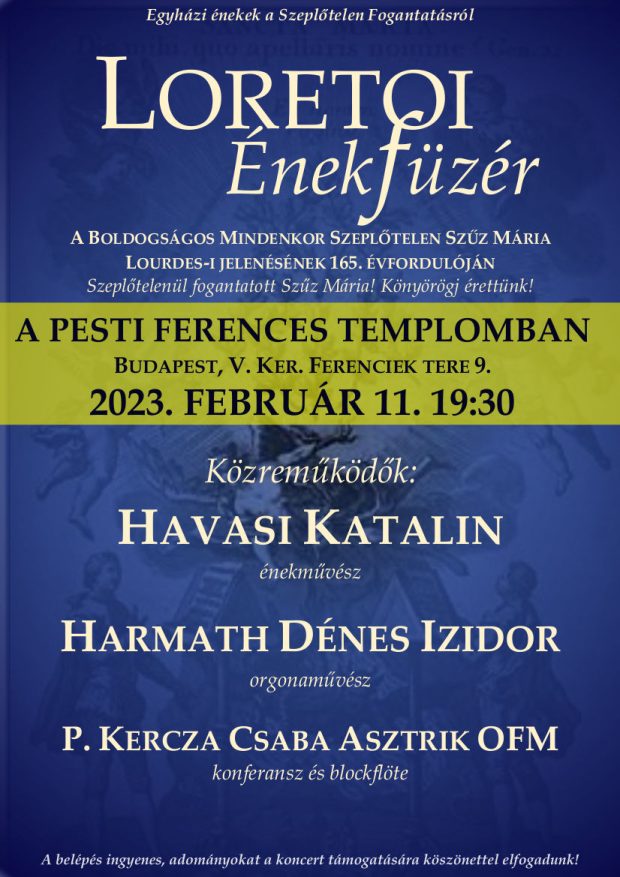 Kercza Asztrik ferences atya szervezésében és közreműködésével szólal meg templomunkban a Loretoi énekfüzér 6. része 2023. február 11-én, szombat este fél 8-kor.
