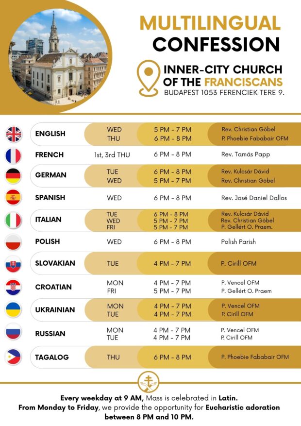 Here at Pesti Ferencesek, we consider it important to provide the opportunity for those who live in Budapest but don’t speak Hungarian, visit us as tourists, or belong to various national minorities to participate in the sacrament of confession.
