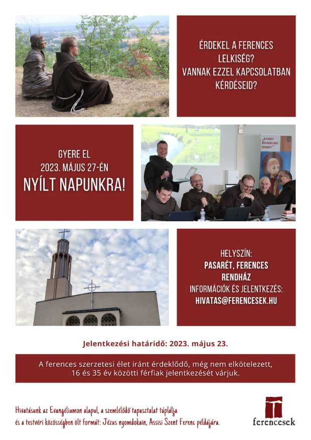 A nyílt nap 2023. május 27-én, szombaton a pasaréti ferences rendházban lesz (Budapest, Pasaréti út 137.).