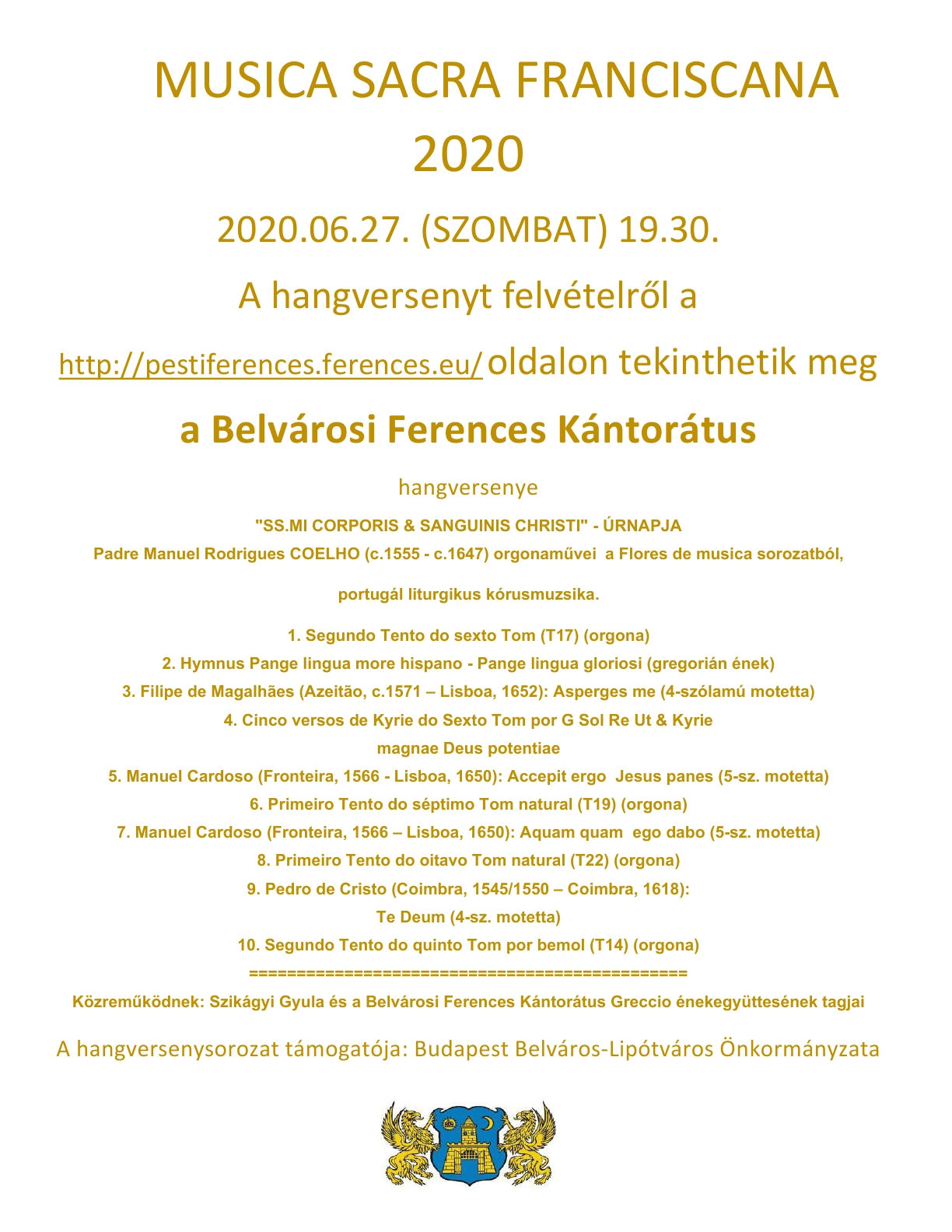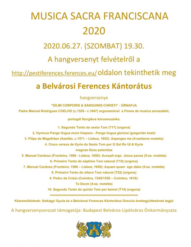 Musica Sacra Franciscana sorozat keretében jún. 27-én, szombaton a Belvárosi Ferences Kántorátus online hangversenye lesz „SS.MI CORPORIS & SANGUINIS CHRISTI” – ÚRNAPJA címmel portugál reneszánsz szerzők műveiből.
