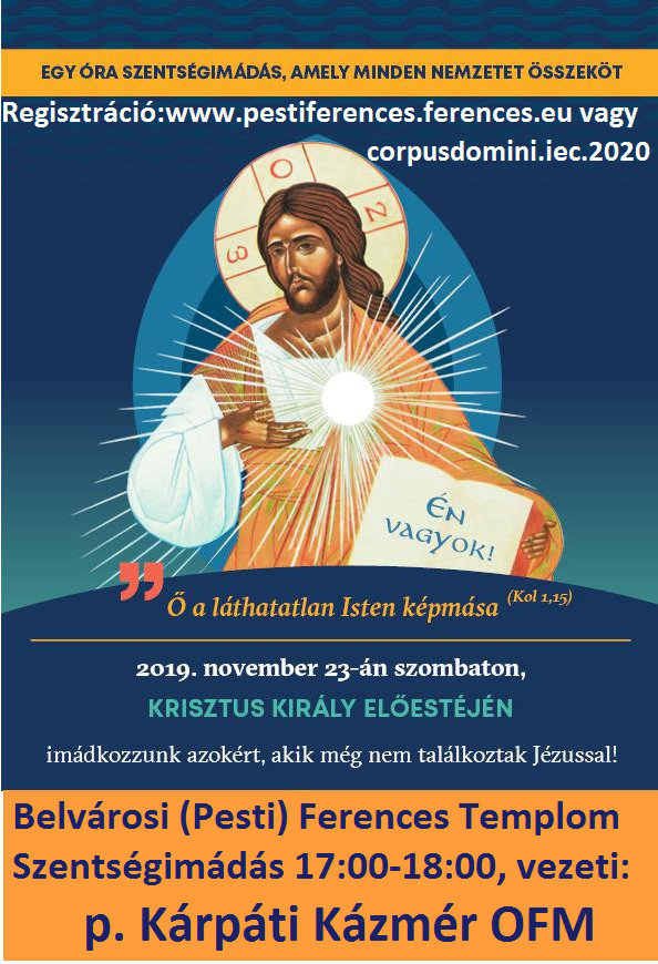 A jövő évi Nemzetközi Eucharisztikus Kongresszusra készülve november 23-án, szombaton (Krisztus Király ünnepének előestéjén) 17.00 órától szentségimádást tartunk templomunkban, hogy egy órán keresztül dicsőítsük az Oltáriszentségben jelenlévő Jézust sok ezer emberrel együtt a világon!