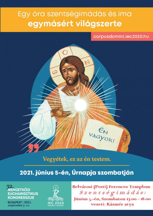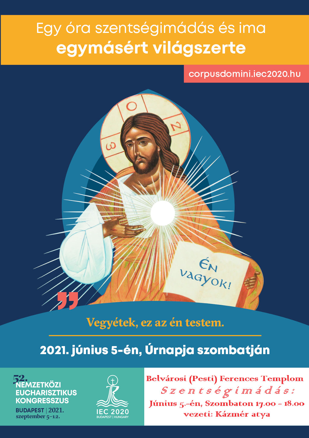 Szeretettel hívunk mindenkit a következő világméretű szentségimádásra június 5-én (Úrnapja előtti szombaton) 17.00 órára a Belvárosi (Pesti) Ferences Templomba, hogy egy órán keresztül dicsőítsük az Oltáriszentségben jelenlévő Jézust sok ezer emberrel együtt a világon!