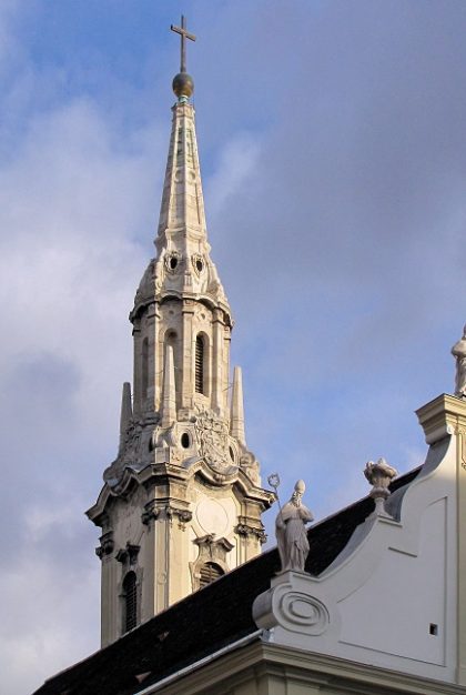Mai templomnak az elődjét IV. Béla király uralkodása idején építették 1250 és 1260 között az akkori városfalon kívül. A törökök kiűzése után ennek a templomnak a romjain építették a mai templomot olasz barokk stílusban. 1743. szeptember 21-én Patachich Gábor kalocsai érsek szentelte fel.